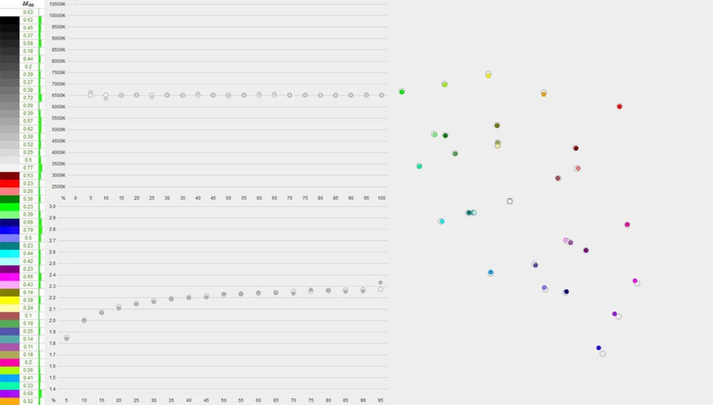After calibration, the average Delta E is reduced to 0.37, while the maximum is down to 0.79. Gamma tracking is accurate and we got a 6513K color temperature.