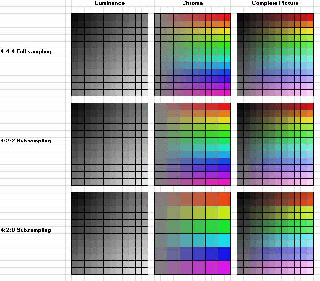 In the 4×2 grid sample above, 4:4:4 represents no chroma subsampling used, whereas 4:2:2 has every other pixel duplicated, and 4:2:0 has bottom pixels copying top pixels.