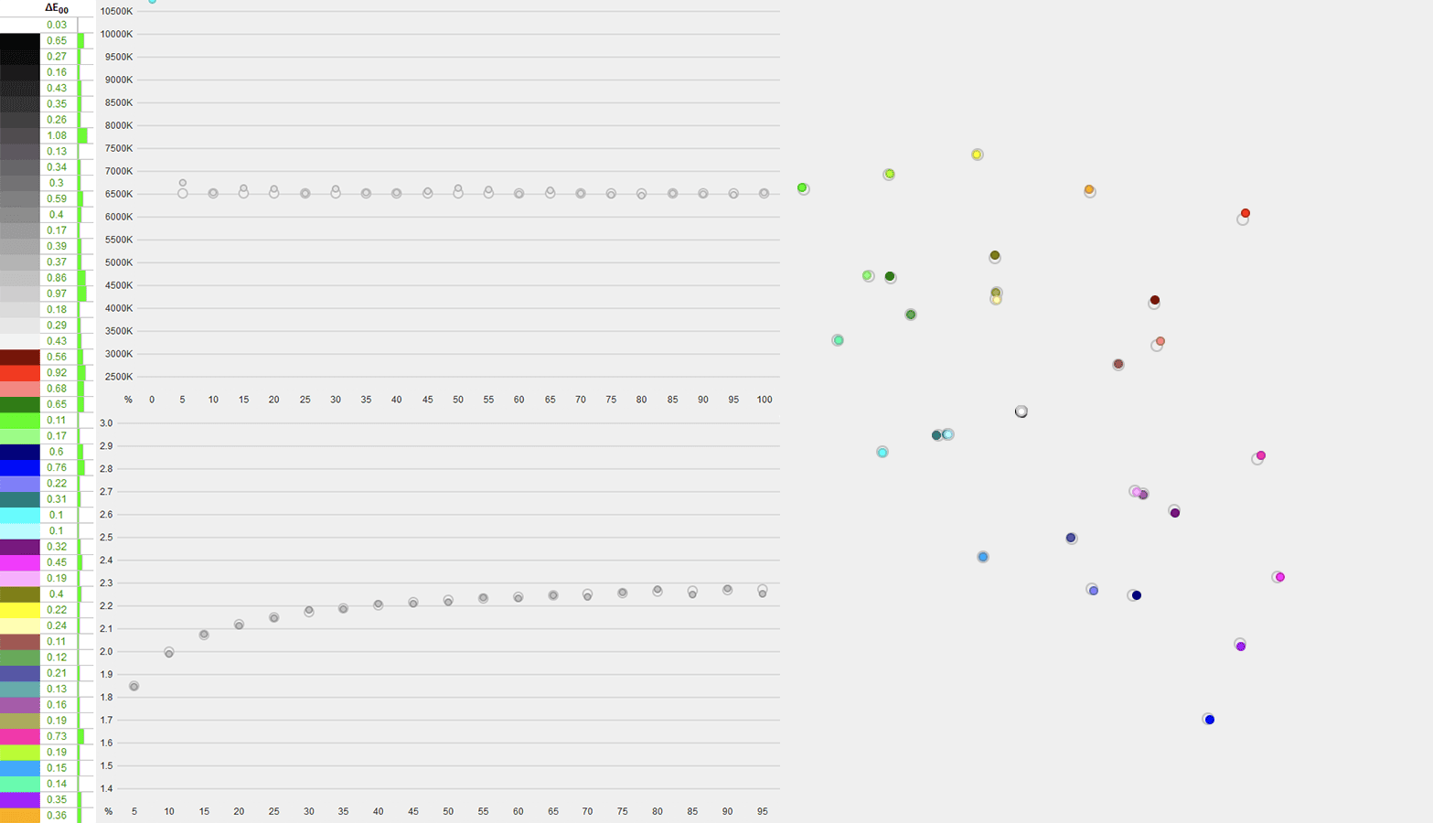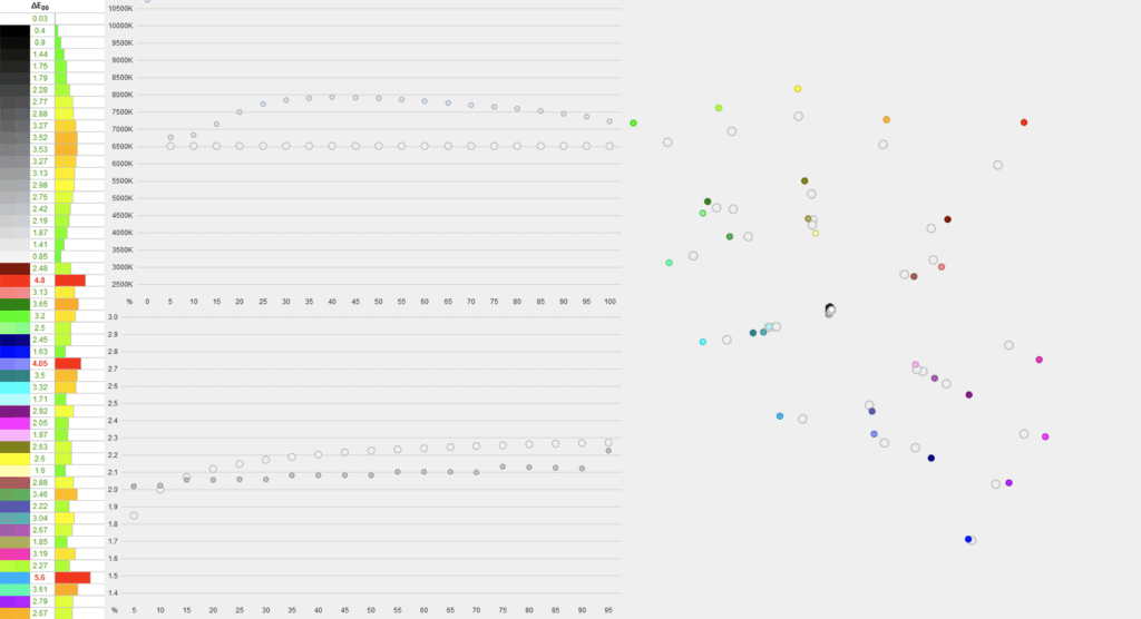This also results in a Delta E of 2.59 average (target is ≤ 1.5) and 5.6 maximum (target is ≤ 3).