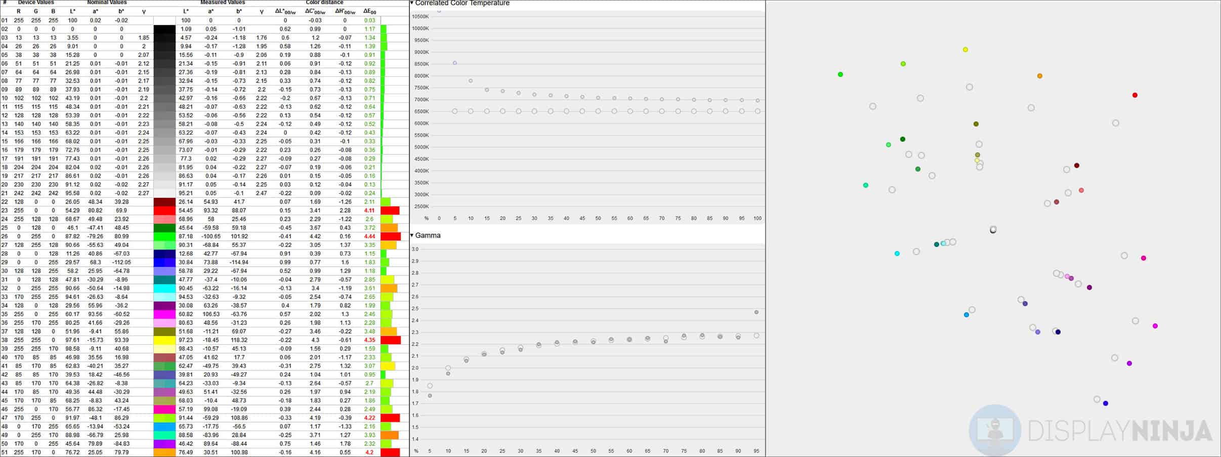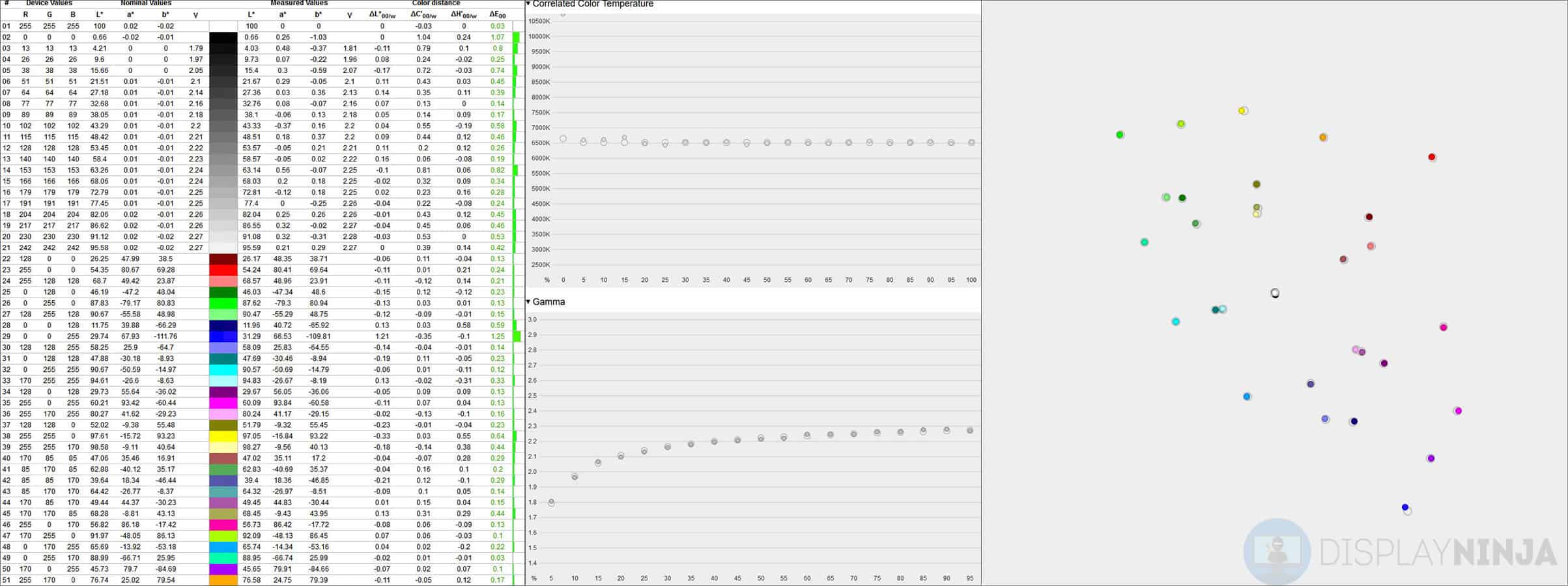 After calibration, the minimum brightness is 47-nits, the maximum is 272-nits, while the average contrast ratio amounts to 1165:1, gamma follows the sRGB tone curve accurately, the maximum delta E is 1.25 and the average Delta E is 0.33.