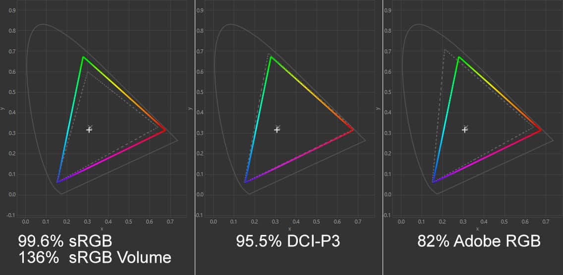 The overall color gamut is also slightly increased with 99.8% sRGB coverage (142.5% gamut size), 96.7% DCI-P3 and 83% Adobe RGB.