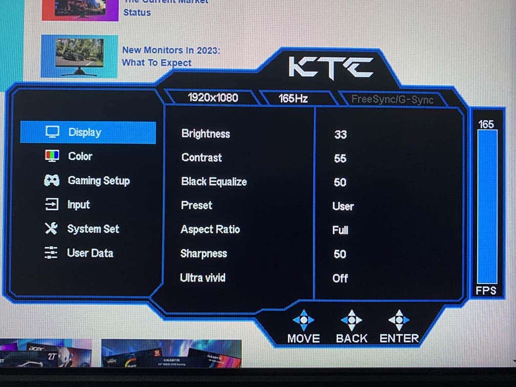 The KTC H24T09 Plus has several picture modes, including User (Default), Standard, Movie, Photo, RTS, FPS1 and FPS2.