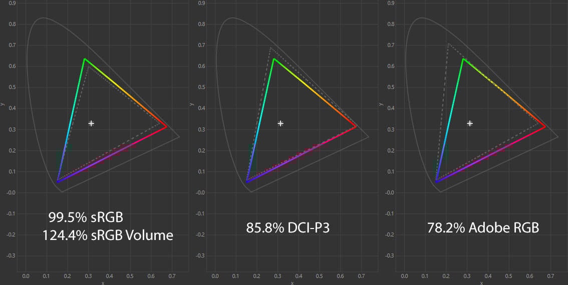 These quick settings also improve the average Delta E from 3.13 to 1.93 (target is ≤ 1.5), which is excellent. The maximum Delta E is 4.82 (down from 5.18, target is ≤ 3), which is mainly due to the monitor’s wide color gamut with a 124.4% measured sRGB gamut volume.