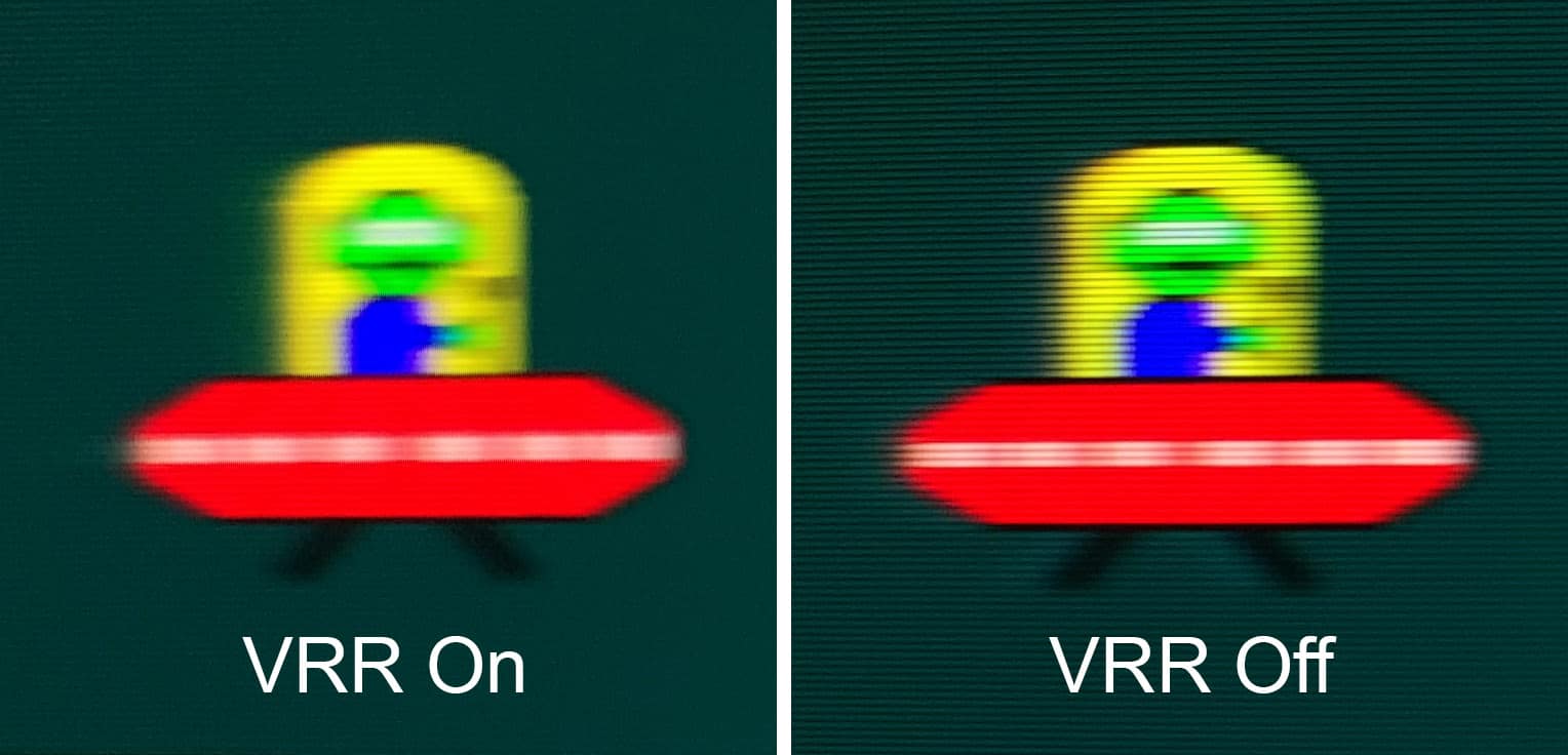 You can see how pixel response time is slightly faster (with a tad of visible overshoot) with VRR disabled below, both images are taken at 165Hz with High overdrive.