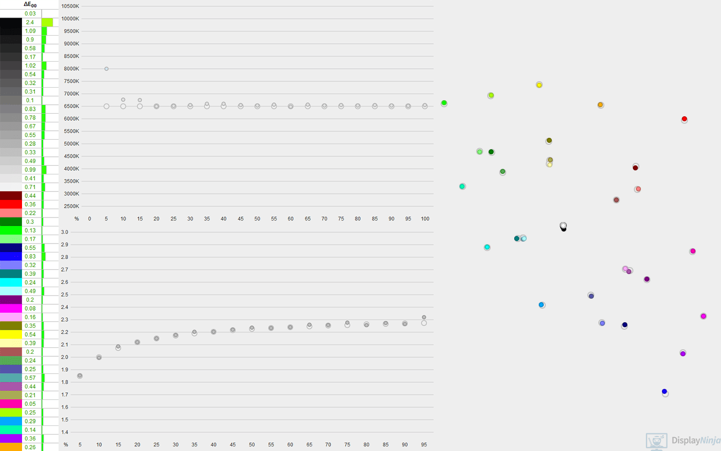Right out of the box, the monitor has the gamma set to 2.4 (with fairly good 2.45 average gamma tracking), while the Normal color temperature mode adds a bluish tint to whitepoint with 8788K (as opposed to the 6500K target).