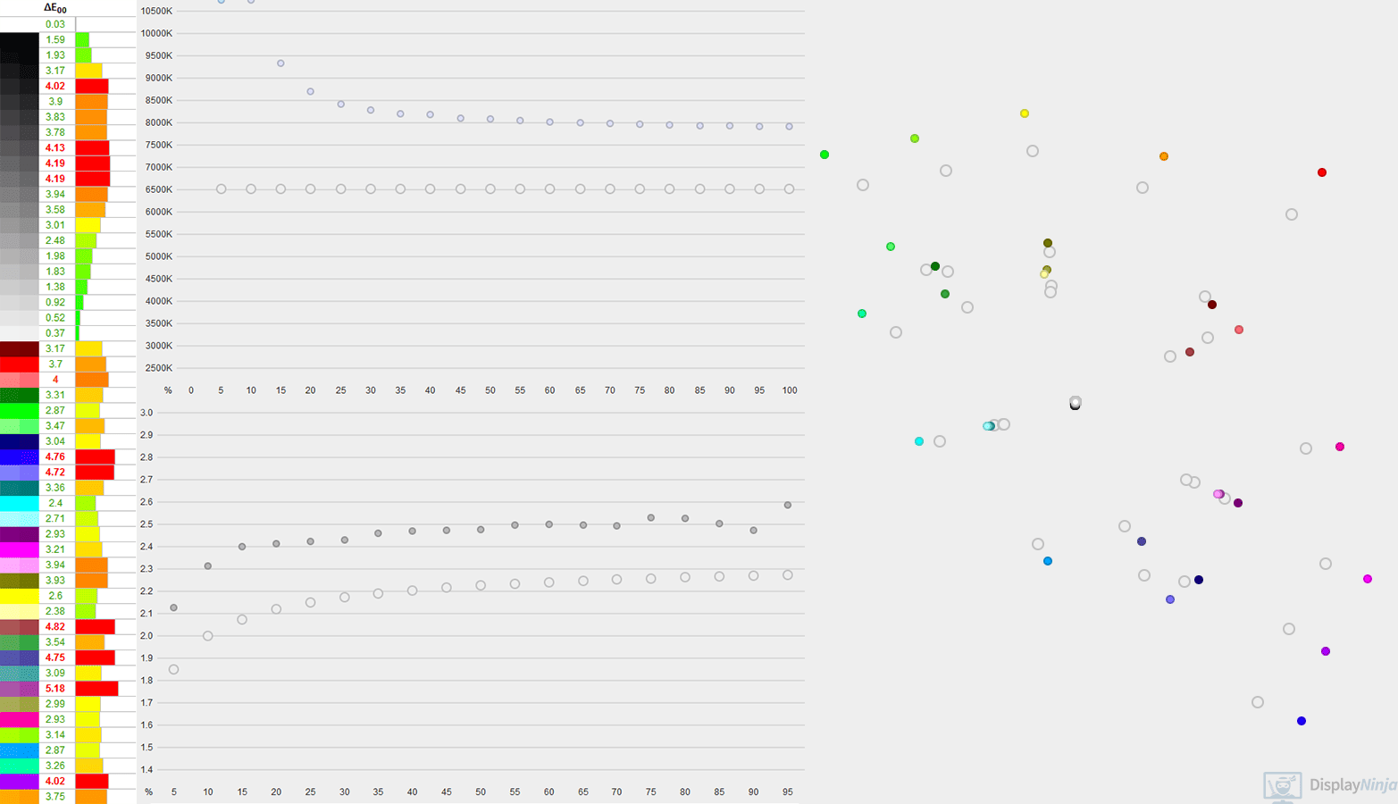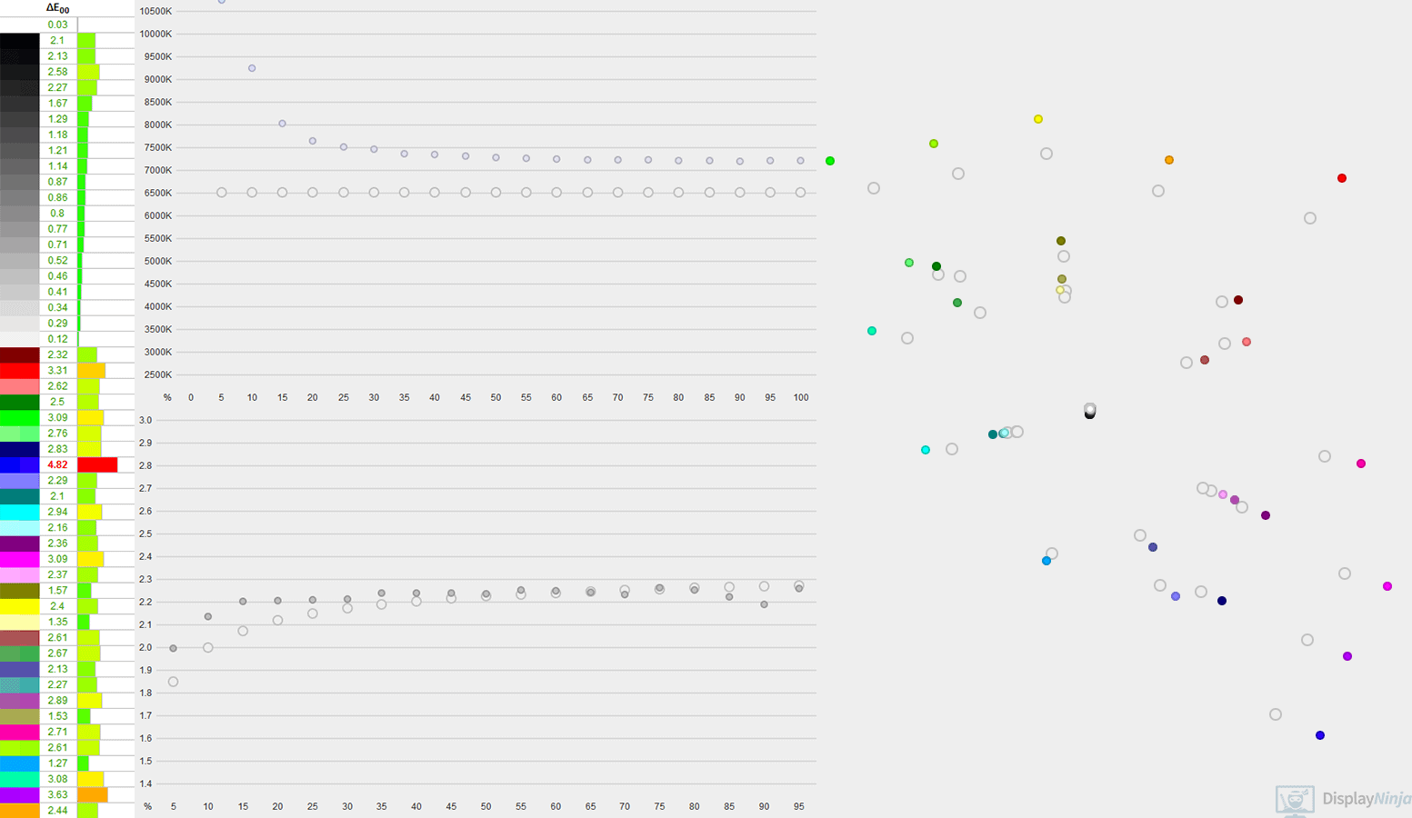 After a full calibration, we further improved the average Delta E to 0.45 and a maximum to 2.4. The gamma follows the sRGB tone curve accurately and we reduced green gain to 43, blue to 38 and left red at the default 50 in the User color temperature mode to get 6537K.