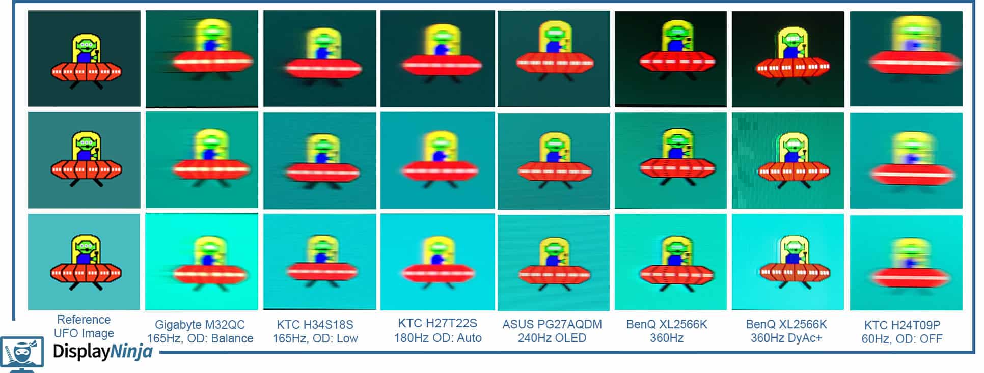 Finally, here’s a comparison with some other monitors we tested. You can see how the KTC H34S18S, for instance, has some noticeable dark level trailing behind the UFO even though it has a faster 3.29ms GtG measured average response time speed. This is because it uses a VA panel with slower dark to bright pixel transitions.
