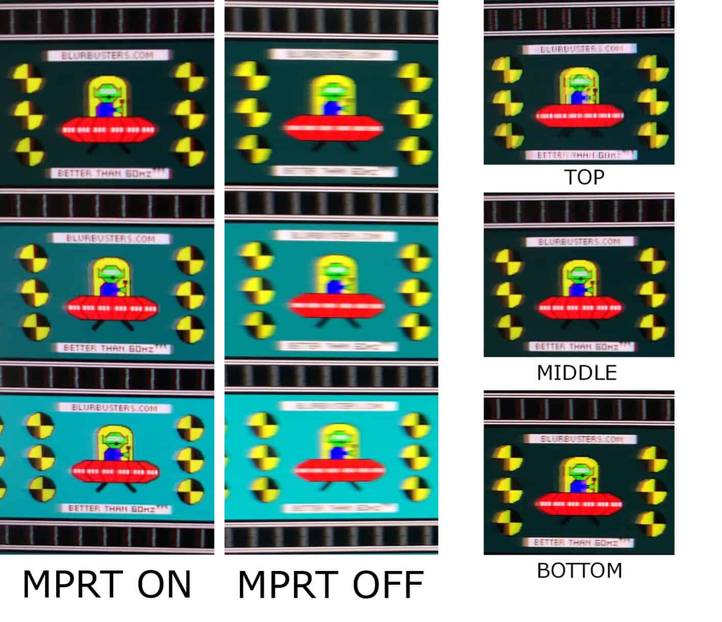 If you’re gaming in a dark room, ~50-nits might be acceptable and MPRT can improve motion performance in fast-paced games, although there’s a bit of strobe crosstalk (image duplication) at the top of the image.