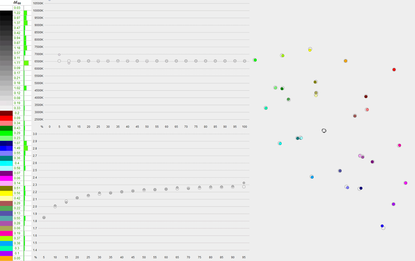 Moving on, after full calibration, we managed to reduce the average Delta E down to 0.45 and the maximum down to 1.77. Gamma tracks the sRGB tone curve accurately and we reduced the red gain to 48, blue to 49 and left green at 50 to get a 6529K color temperature.