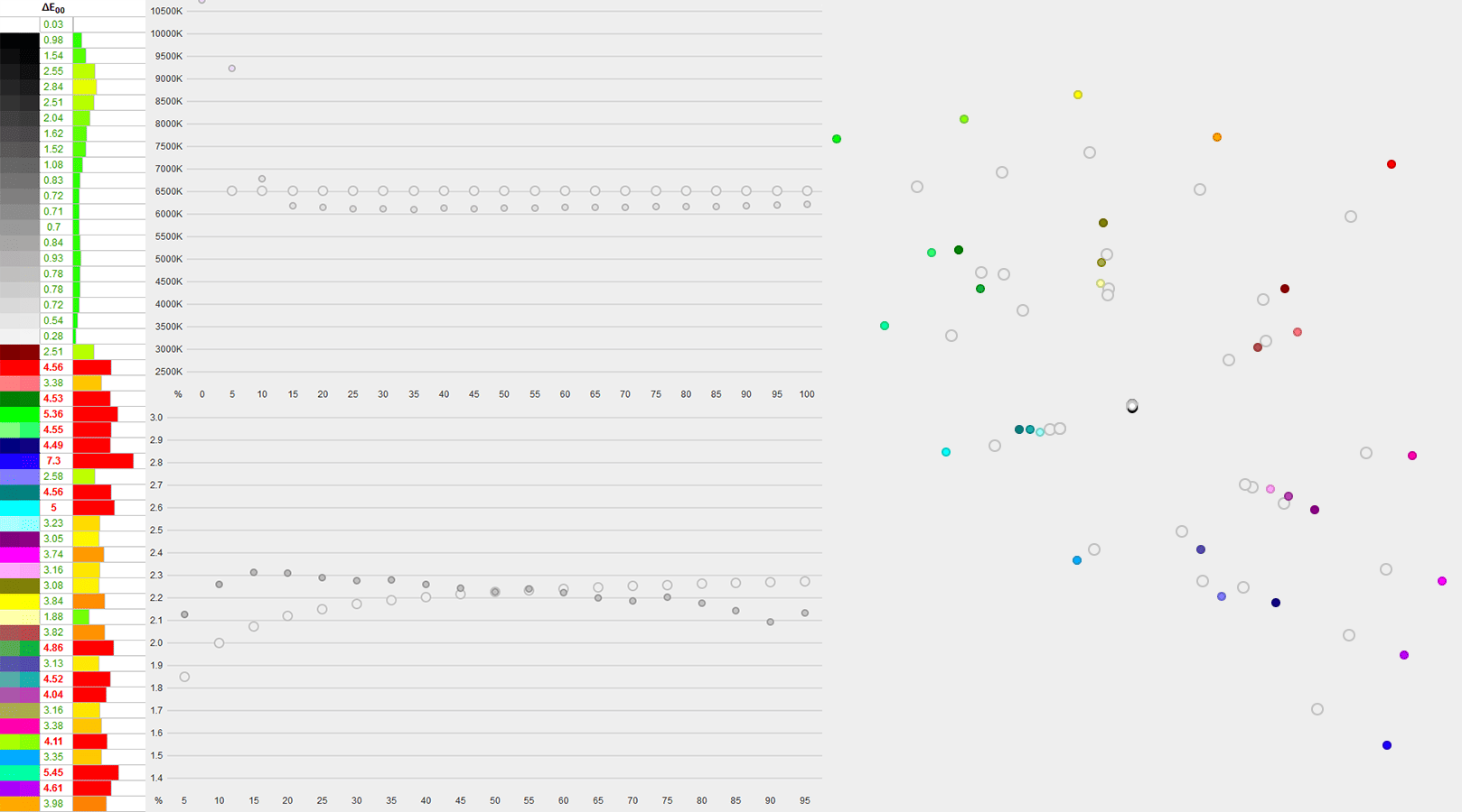 Note that we changed the color temperature from the default Warm mode with a bluish 7493K tint to User, which brought it down to 6354K, much closer to the 6500K target.