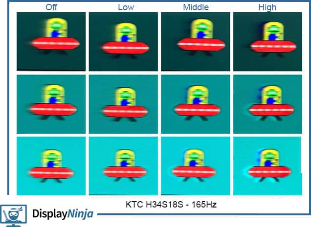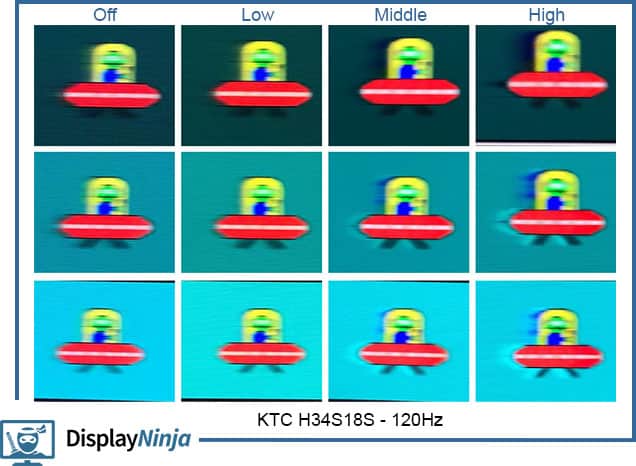 The KTC H34S18S has four response time overdrive modes: Off, Low, Middle and High. The ‘High’ mode is too aggressive as it pushes the pixels to change too fast thus causing overshoot (or inverse ghosting), while the ‘Off’ mode is too slow, which results in noticeable trailing behind fast-moving objects.