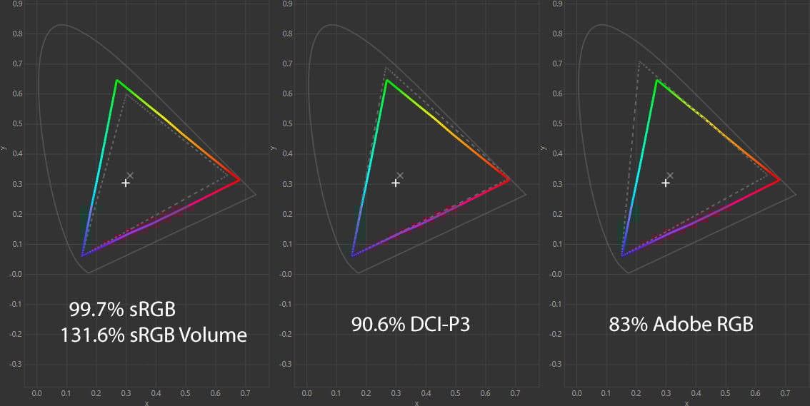 It’s worth noting that we measured a lower DCI-P3 color space coverage than the specified 98%, but the display has a higher sRGB volume than the specified 123%.