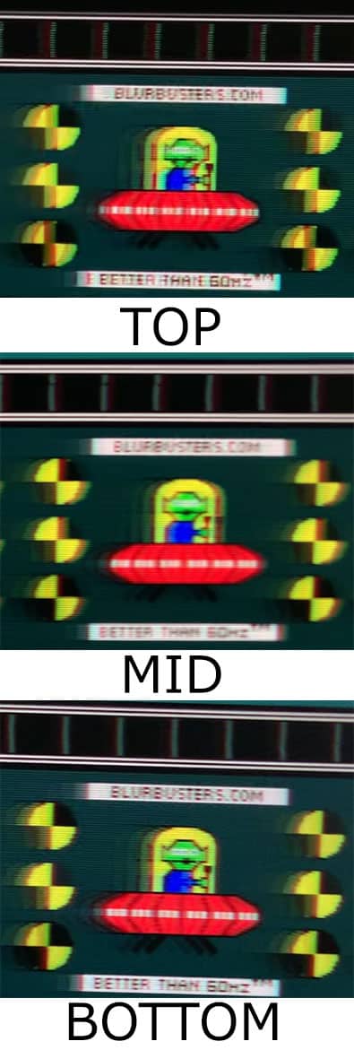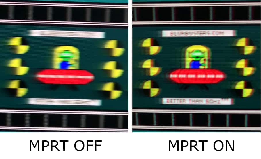 As you can see, MPRT reduces motion blur but it still has some strobe crosstalk (the image duplication effect), which is most noticeable on the upper and center part of the screen.