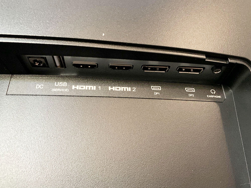 Connectivity options include two DisplayPort 1.4 inputs, two HDMI 2.0 ports (limited to 100Hz at 3440×1440 – or 120Hz at 2560×1440 and 2560×1080), a headphone jack, a USB port for service/firmware updates and an external power supply.