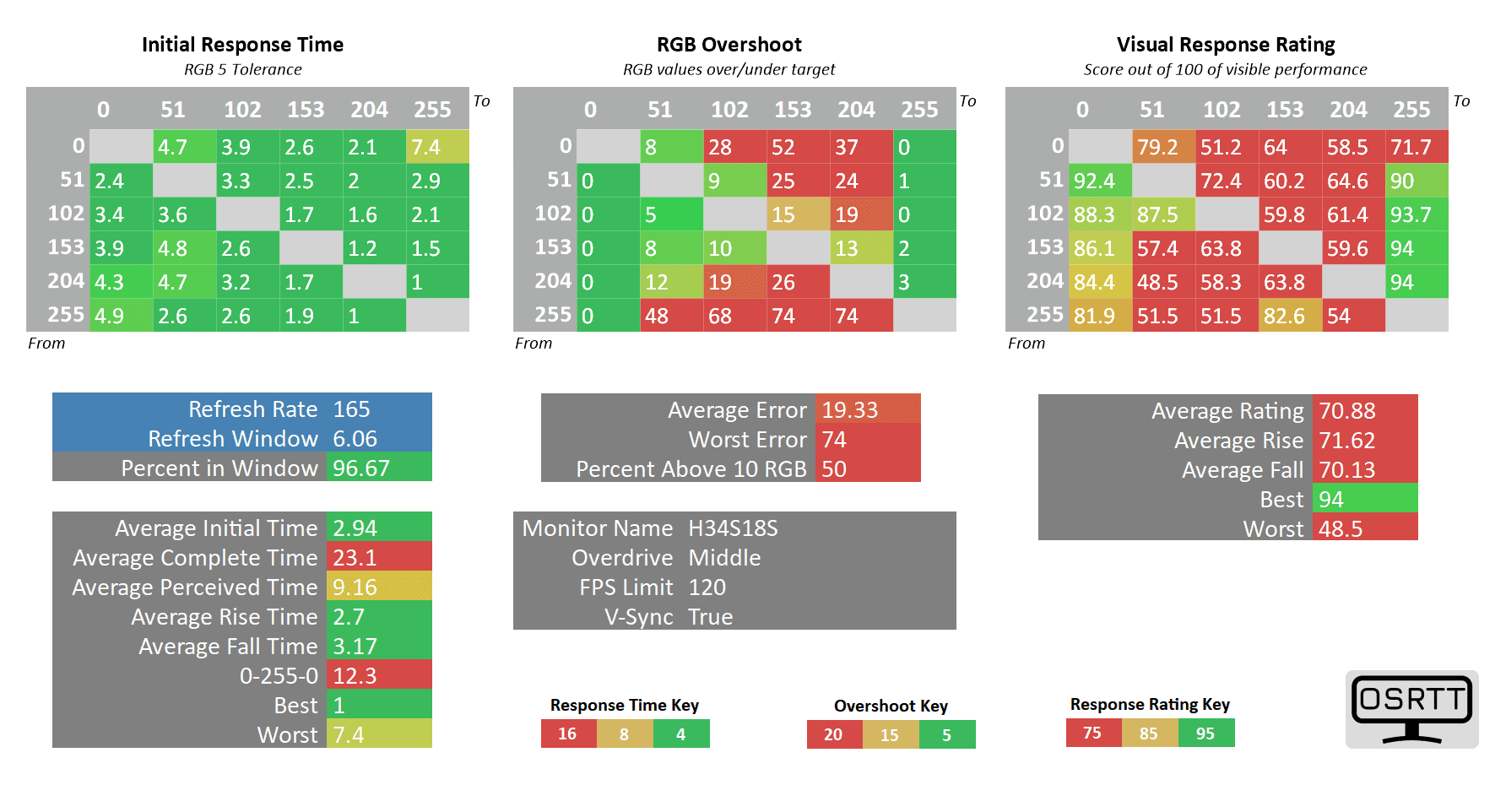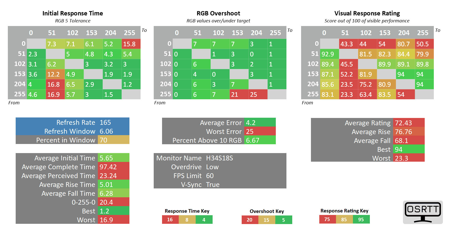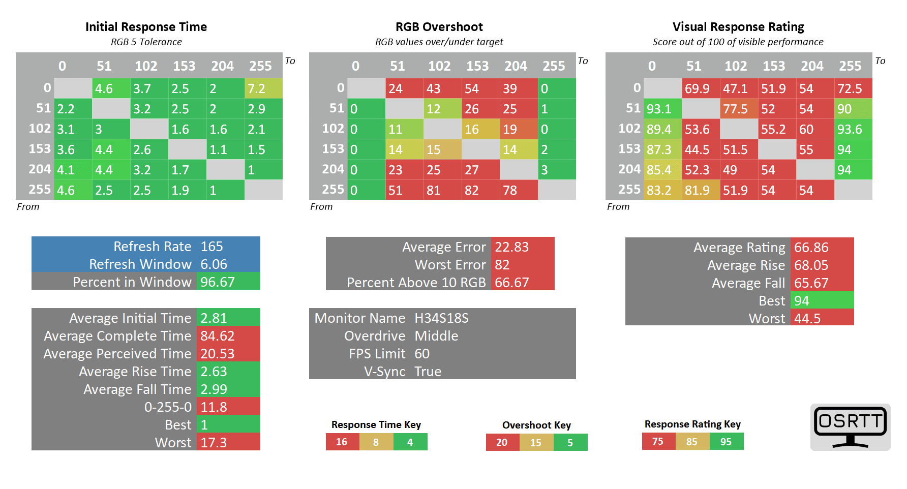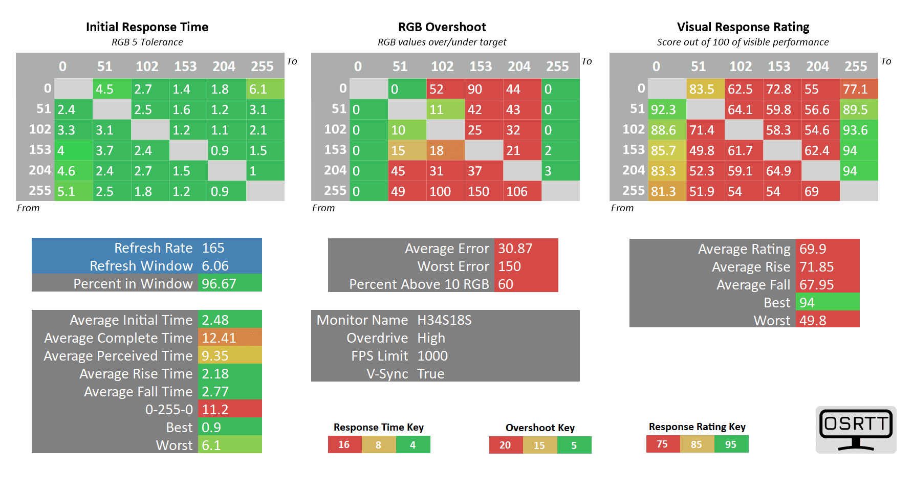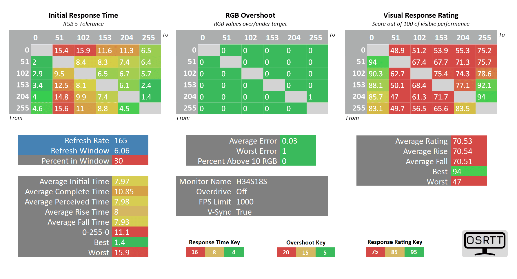 As you can see, the 0 up to 51 RGB transitions are still high at 11ms (almost double the 6.06ms refresh rate cycle of 165Hz), but the only ghosting-related issues we noticed in games are the flickering-like artifacts caused by too strong sharpening filters (which can be disabled in most games).