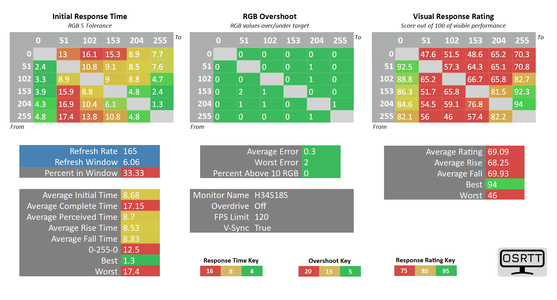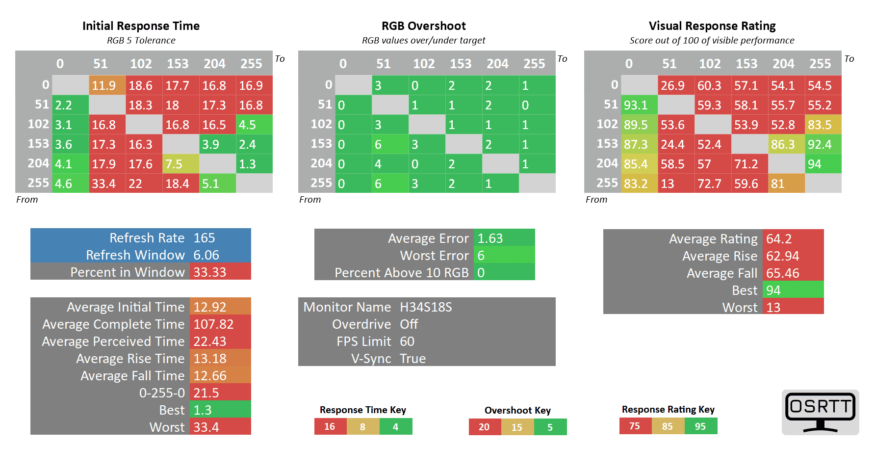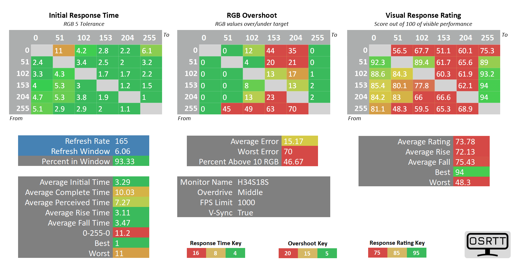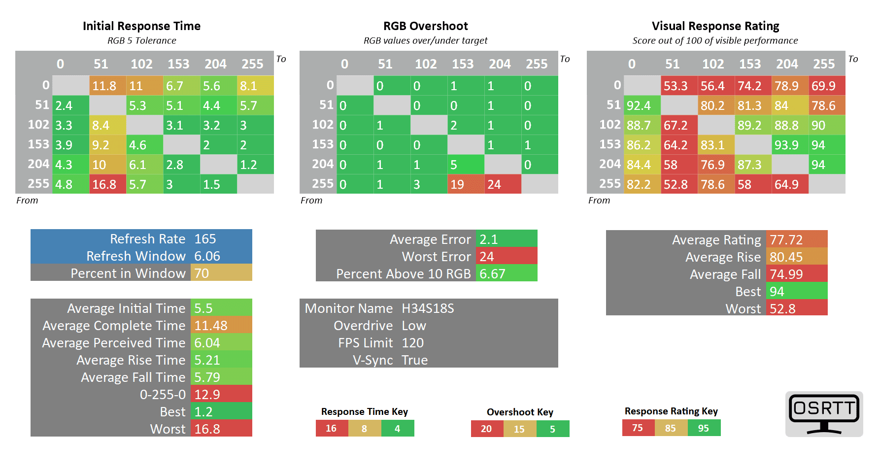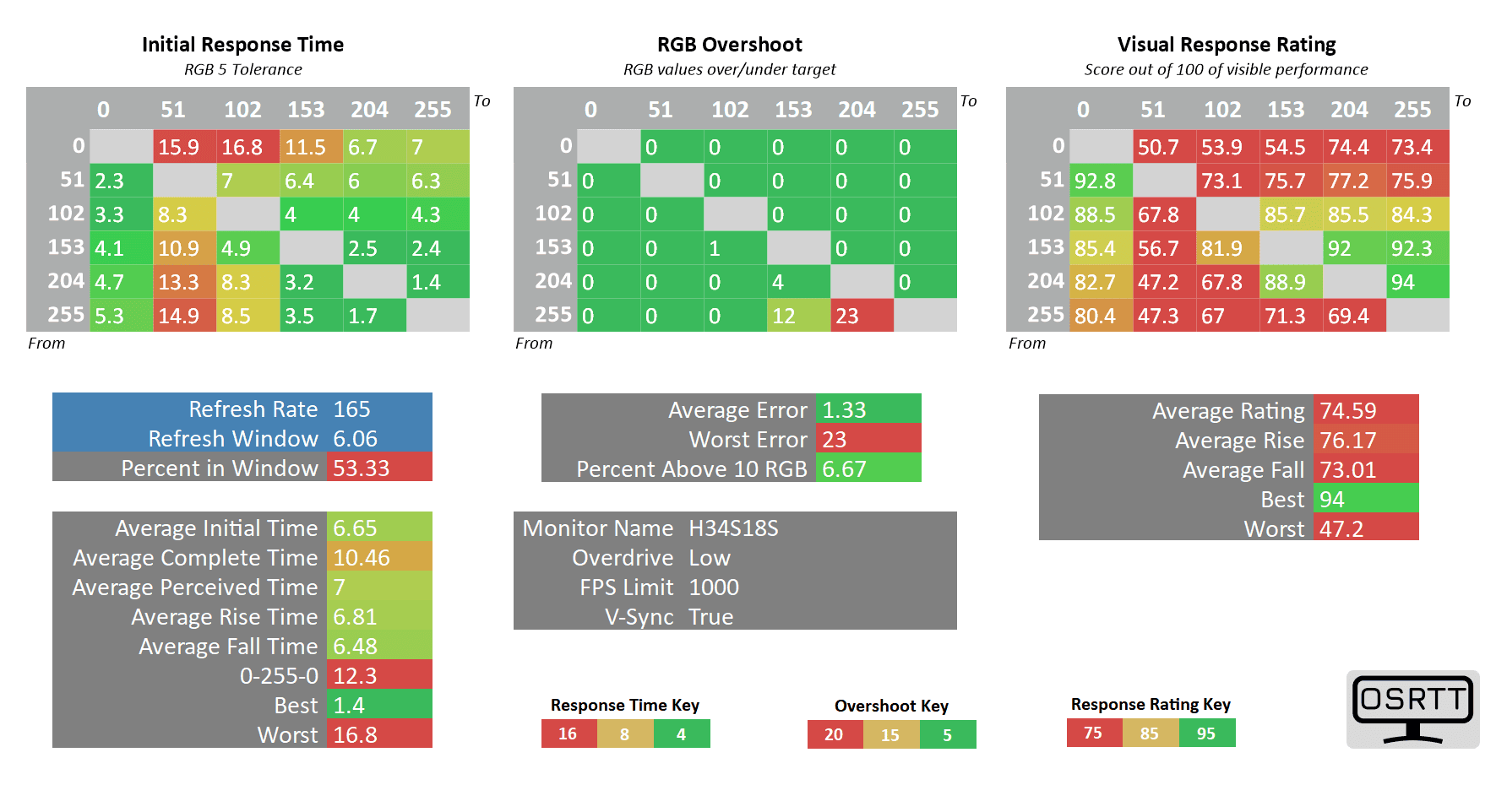 As you can see, the 0 up to 51 RGB transitions are still high at 11ms (almost double the 6.06ms refresh rate cycle of 165Hz), but the only ghosting-related issues we noticed in games are the flickering-like artifacts caused by too strong sharpening filters (which can be disabled in most games).