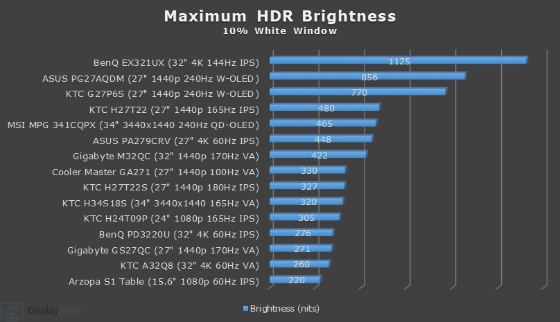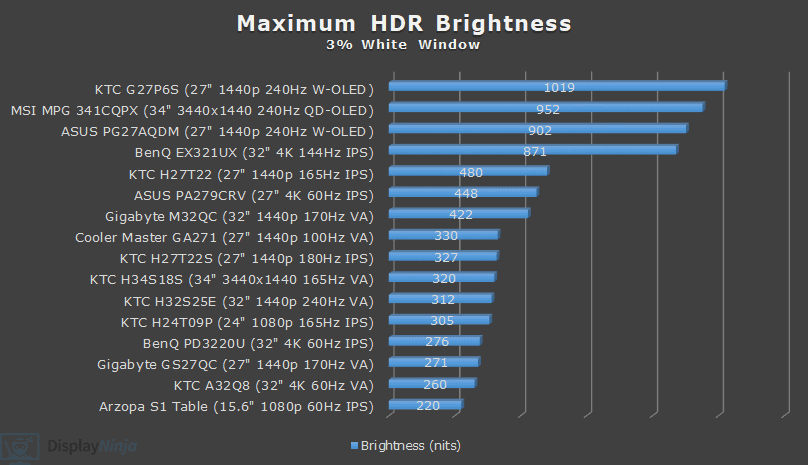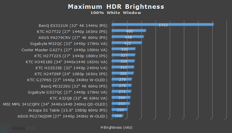 We actually measured a lower 320-nits brightness in HDR mode with a too-high 7415K color temperature resulting in a bluish tint to whitepoint, and color settings are locked in the HDR mode, so it cannot be improved.