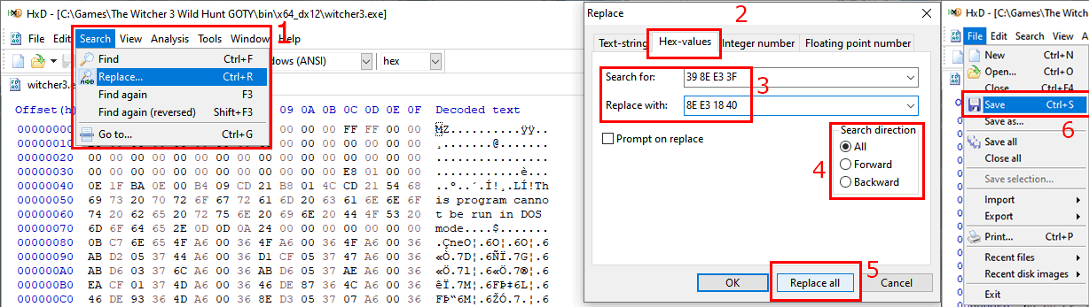 Download HxD, drag and drop the .exe game file to it, go to ‘Replace…‘, select the ‘Hex-values‘ tab, put ‘39 8E E3 3F‘ in the ‘Search for‘ box, and ‘8E E3 18 40‘ in the ‘Replace with‘ box, select ‘All‘ for search direction, ‘Replace All‘ and ‘Save‘. The program will automatically create a backup .exe file as well.