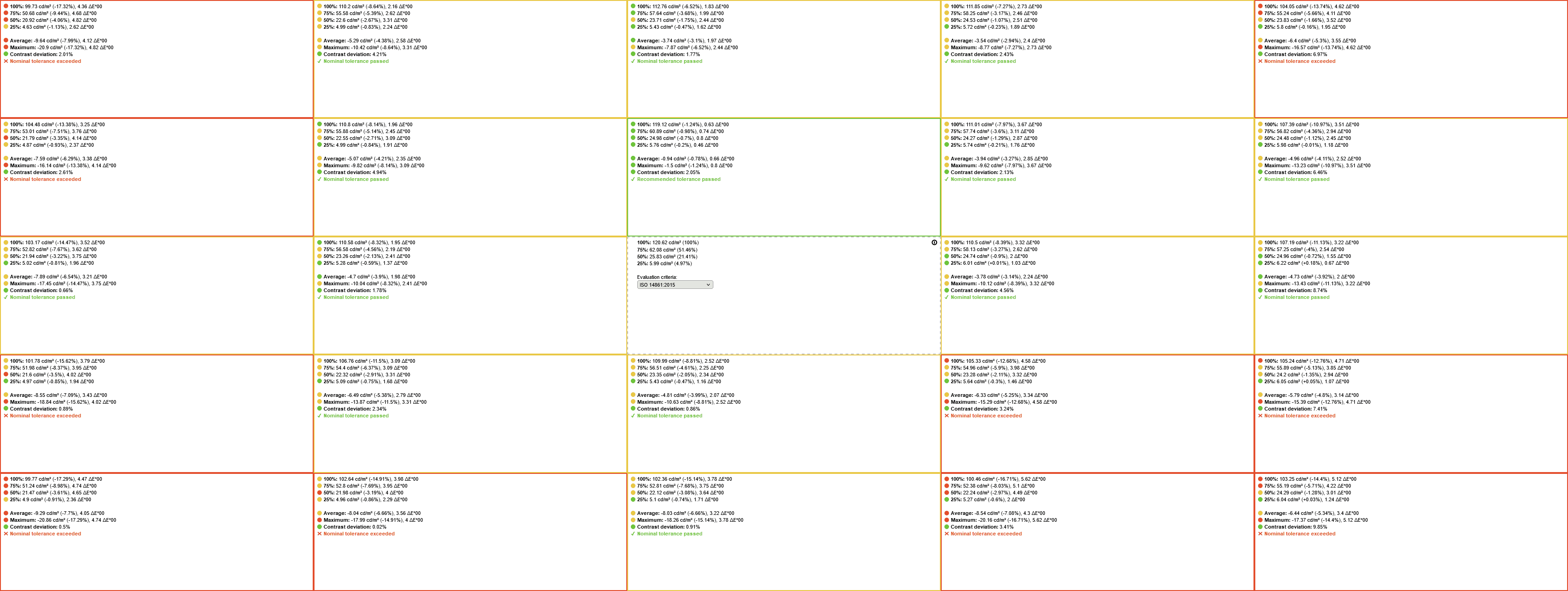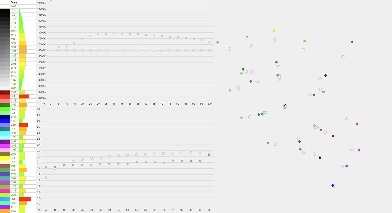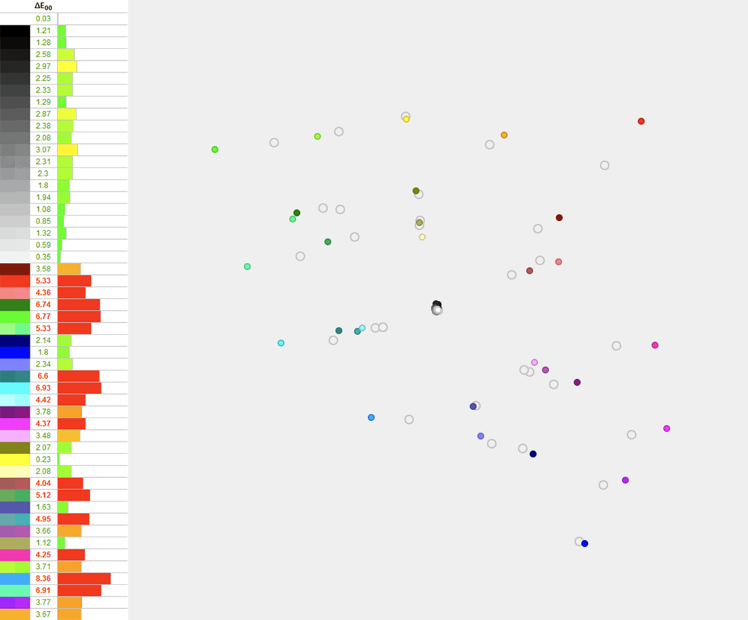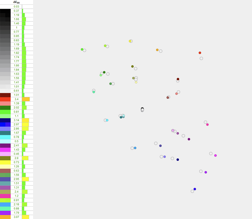 This also results in a Delta E of 2.59 average (target is ≤ 1.5) and 5.6 maximum (target is ≤ 3).